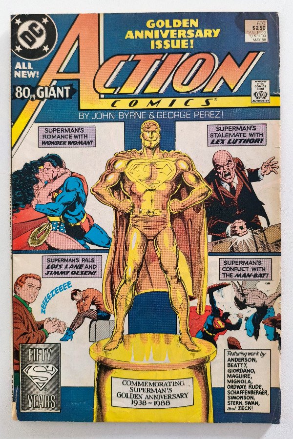 Key issue: Clásico número aniversario por los 50 años de Superman, edición gigante con historia central de Byrne y Pérez donde Superman y Wonder Woman enfrentan a Darkseid, acompañada por relatos y pin-ups de artistas destacados como Swan, Mignola, Giordano, Maguire y Simonson.