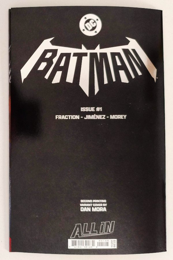 Key issue: Portada variante segunda impresión, virgin foil, por Dan Mora. Primer número de la nueva serie de Batman, con Matt Fraction en guión y Jorge Jiménez en arte. Un punto de partida fresco que mezcla legado y evolución, con la introducción de su nuevo traje, un Batmobile actualizado y una Gotham revisitada.